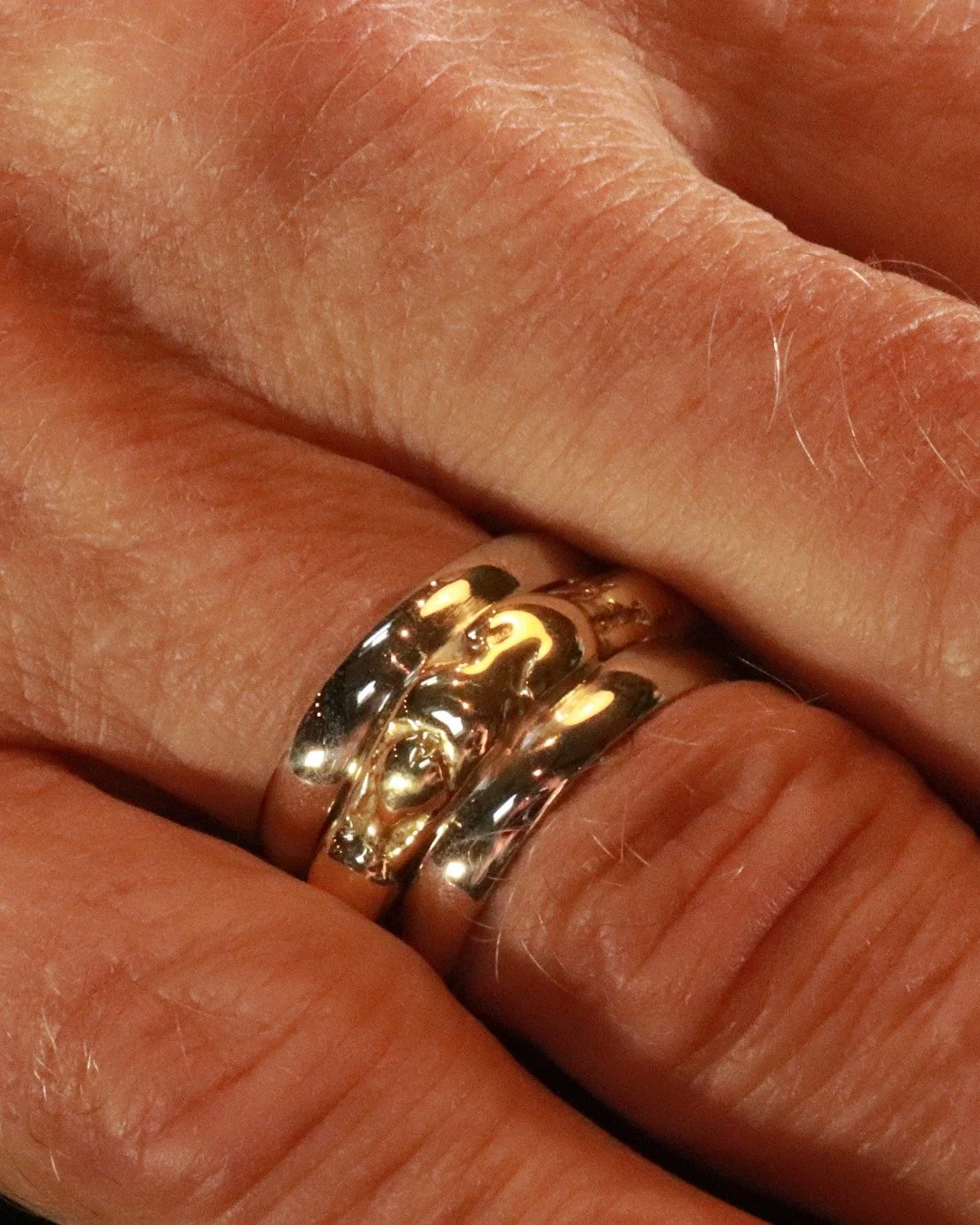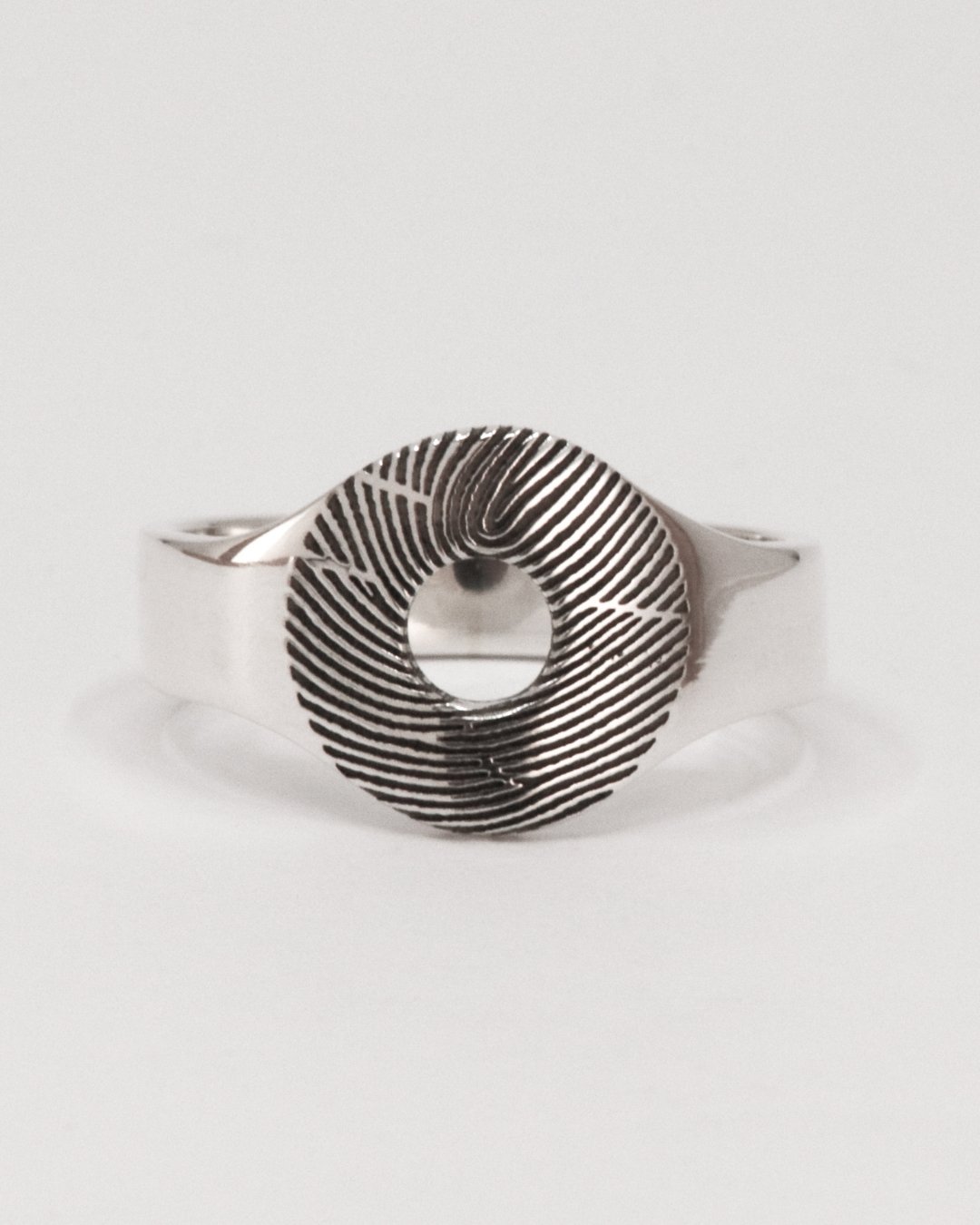 Gedenk en rouwsieraad: Ring uitgevoerd in massief goud met zichtbare as en vingerafdruk. Vervaardigd van oud-dierbaar goud van de opdrachtgever.